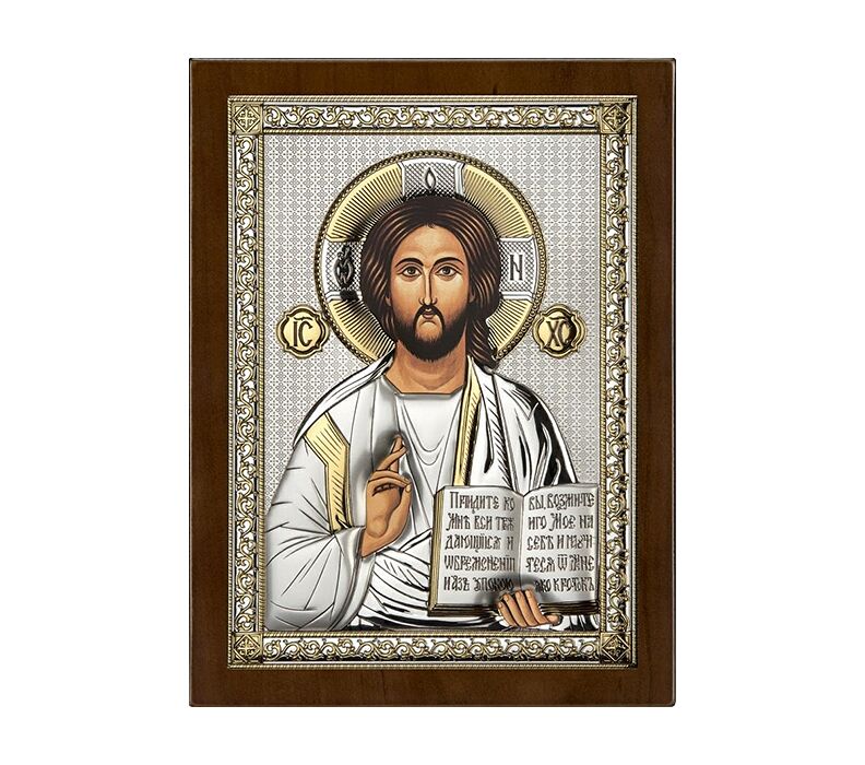 • Ikone Christus Pantokrator – ein ausdrucksstarkes Werk der traditionellen sakralen Ikonenkunst. Die Darstellung zeigt Christus mit offenem Buch, das für Weisheit und das Wort Gottes steht, sowie im Segensgestus – ein Symbol für seine göttliche Liebe und schützende Gegenwart. Die Kombination aus edlen silbernen Elementen und feinen Vergoldungen unterstreicht den würdevollen, sakralen Charakter der Ikone. Präzise ausgearbeitete Details und harmonisch abgestimmte Ornamente verleihen der Darstellung eine besondere Tiefe und Ausdruckskraft. Der dekorative Hintergrund mit dezentem Muster sowie der hochwertige Holzrahmen betonen den klassischen Stil dieser Ikone. Ideal als religiöse Wanddekoration oder als bedeutungsvolles Geschenk zu Anlässen wie Taufe, Firmung oder Hochzeit.