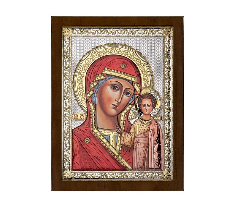 • Hochwertige Ikone der Muttergottes mit dem Jesuskind in farbiger Ausführung, inspiriert von der traditionellen sakralen Ikonenkunst. Die harmonisch abgestimmten Farben verleihen dem Motiv eine besondere Tiefe und Ausdruckskraft, während die veredelten silbernen Elemente die Details eindrucksvoll hervorheben. Feine goldene Verzierungen und ornamental gestaltete Rahmenmotive unterstreichen den feierlichen, würdevollen Charakter der Ikone. Der liebevolle Blick der Gottesmutter und des Kindes strahlt Ruhe, Geborgenheit und spirituelle Wärme aus und macht diese Darstellung zu einem zeitlosen Symbol für Glaube, Liebe und Schutz. Die Ikone eignet sich ideal als stilvolle Wanddekoration sowie als besonderes Geschenk zu religiösen Anlässen wie Taufe, Kommunion oder Hochzeit – eine wertvolle Erinnerung mit spiritueller Bedeutung.