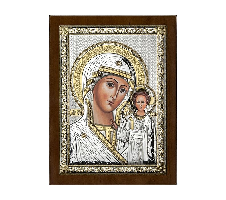 • Hochwertige Ikone der Muttergottes mit dem Jesuskind, gestaltet im Stil der traditionellen sakralen Ikonenkunst. Die zentrale Darstellung ist mit edlen silbernen Elementen veredelt, die die Feinheit und Ausdruckskraft des Motivs besonders hervorheben. Zarte goldene Details und reich verzierte Ornamente verleihen der Ikone Tiefe und eine feierliche, würdige Ausstrahlung. Der liebevolle Blick der Gottesmutter und des Kindes vermittelt Ruhe, Geborgenheit und spirituelle Wärme – ein zeitloses Symbol für Glaube, Liebe und Schutz. Diese Ikone eignet sich sowohl als stilvolle Wanddekoration als auch als besonderes Geschenk zu religiösen Anlässen wie Taufe, Kommunion oder Hochzeit.