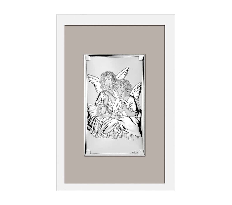 • Klassisches Silberbild mit Schutzengel-Motiv – zwei Engel wachen liebevoll über ein schlafendes Kind. Das Motiv ist auf einer eleganten, zweilagigen Basis in Weiß und Beige angebracht und wirkt dadurch besonders hochwertig. Eine schöne Geschenkidee zur Taufe oder zum ersten Geburtstag. Mit seinem dezenten Glanz bringt das Bild eine ruhige, geborgene Atmosphäre ins Kinderzimmer und wird zu einer bleibenden Erinnerung.