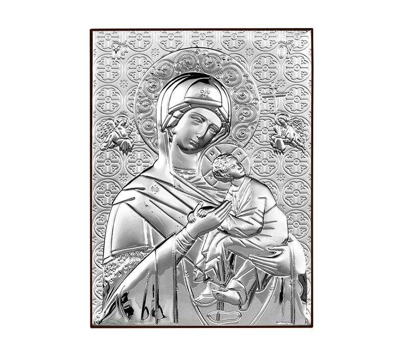 • Silberne Ikone mit dem Bildnis der Lieben Frau von der immerwährenden Hilfe. Maria wird als Beschützerin und Fürsprecherin dargestellt, die das Jesuskind auf den Armen hält und von Engeln umgeben ist, die die Werkzeuge der Passion Christi tragen. Dieses Bild symbolisiert Fürsorge und ständige Hilfe in Lebensnotlagen und ist ein beliebtes Geschenk für tiefgläubige Menschen.