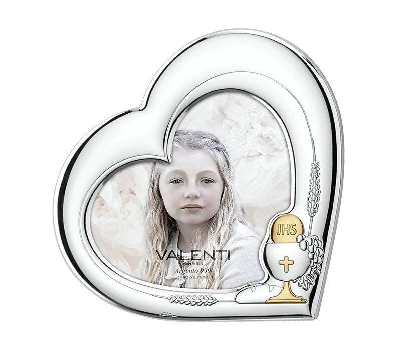 • Silberner Fotorahmen zur Erstkommunion in Herzform von Valenti – eine stilvolle und emotionale Erinnerung an einen der wichtigsten Tage im Leben eines Kindes. Die elegante Herzform unterstreicht den festlichen Charakter der Kommunion und macht den Rahmen zu etwas ganz Besonderem. Feine Verzierungen mit eucharistischem Kelch und Hostie (IHS), Ähren und Trauben greifen die Symbolik der Eucharistie auf und verleihen dem Rahmen eine tiefere religiöse Bedeutung. Die Kombination aus glänzendem Silber und dezenten goldenen Akzenten sorgt für eine harmonische, edle Optik. Ideal als Geschenk zur Kommunion für Mädchen oder Jungen – von Paten, Großeltern oder der Familie. Mit einem Foto von diesem besonderen Tag wird der Rahmen zu einer bleibenden Erinnerung, die auch nach vielen Jahren noch berührt.