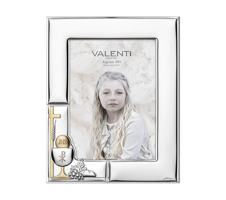 • Eleganter silberner Fotorahmen für Kommunionsfotos – stilvoll, zeitlos und perfekt, um diesen besonderen Tag für immer festzuhalten. Die klassische, glatte Form wird durch eine dezente Verzierung im unteren Eck veredelt: ein Kreuz, ein eucharistischer Kelch mit dem IHS-Monogramm sowie ein feines Traubenmotiv, das den religiösen und festlichen Charakter der Erstkommunion unterstreicht. Das Zusammenspiel der glänzenden Silberoberfläche mit zarten goldenen Akzenten verleiht dem Rahmen eine edle, harmonische Ausstrahlung, die sich elegant in jedes Zuhause einfügt. Eine wunderschöne Geschenkidee zur Ersten Heiligen Kommunion – ideal von Eltern, Paten oder Großeltern, um einem Kind eine bleibende Erinnerung mit auf den Lebensweg zu geben.