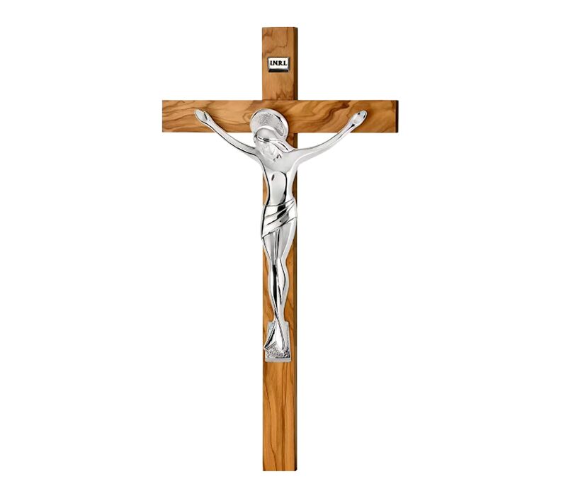 • Besonderes Wandkreuz, das die natürliche Schönheit von Olivenholz mit der eleganten Ausstrahlung silberner Veredelung verbindet. Die sorgfältig gearbeitete Christusfigur wurde mit einer feinen Silberschicht überzogen, wodurch das Kreuz besonders edel und wirkungsvoll erscheint. Der warme Farbton des Olivenholzes mit seiner charakteristischen Maserung bildet einen harmonischen Kontrast zur glänzenden silbernen Christusfigur und unterstreicht den spirituellen und zeitlosen Charakter dieses Kreuzes. Das Kreuz eignet sich hervorragend als stilvolles Element der Wohnraumgestaltung oder als Geschenk zu wichtigen religiösen Anlässen. Ein schönes Zeichen des Glaubens, das jedem Raum eine Atmosphäre von Ruhe, Besinnung und innerer Einkehr verleiht.